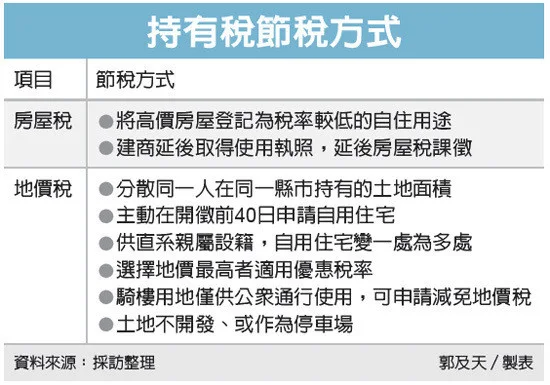 對於如何在持有稅節稅,地政士公會名譽理事長王進祥表示,適用較低稅率是持有稅節稅的唯一方法,房屋稅透過適用三戶自住以適用1.2%稅率是唯一節稅管道,包括一般事務所或營業用的房屋用途,需變更為住家。